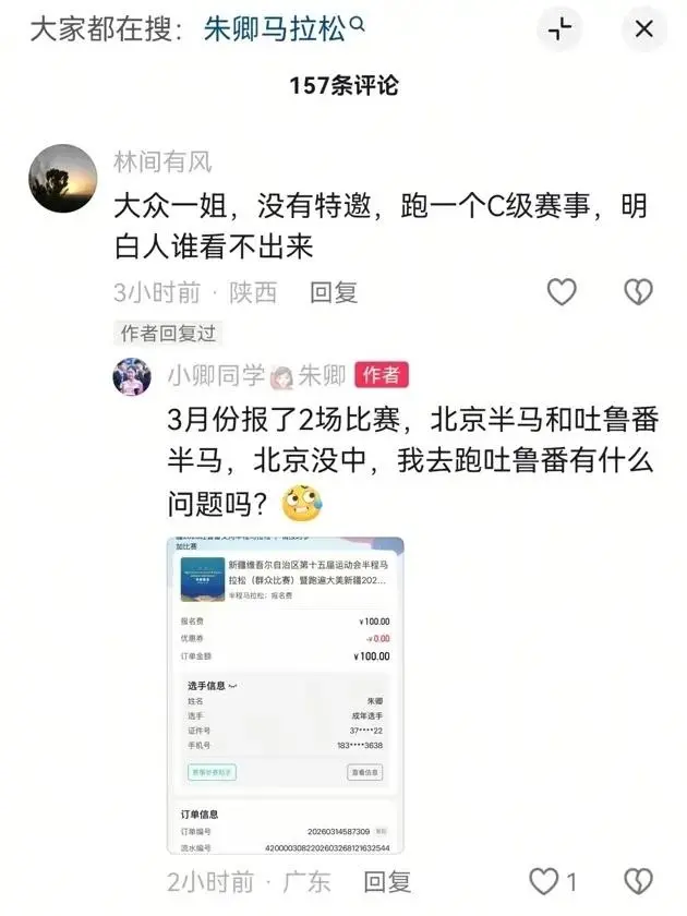 这句话算是彻底把朱卿惹毛了。她当场就炸了,直接甩出截图。一千块报名费明明白白摆在那。她怒吼着回怼。我三月早就报了两场,北京没中签,我跑吐鲁番有毛病吗?